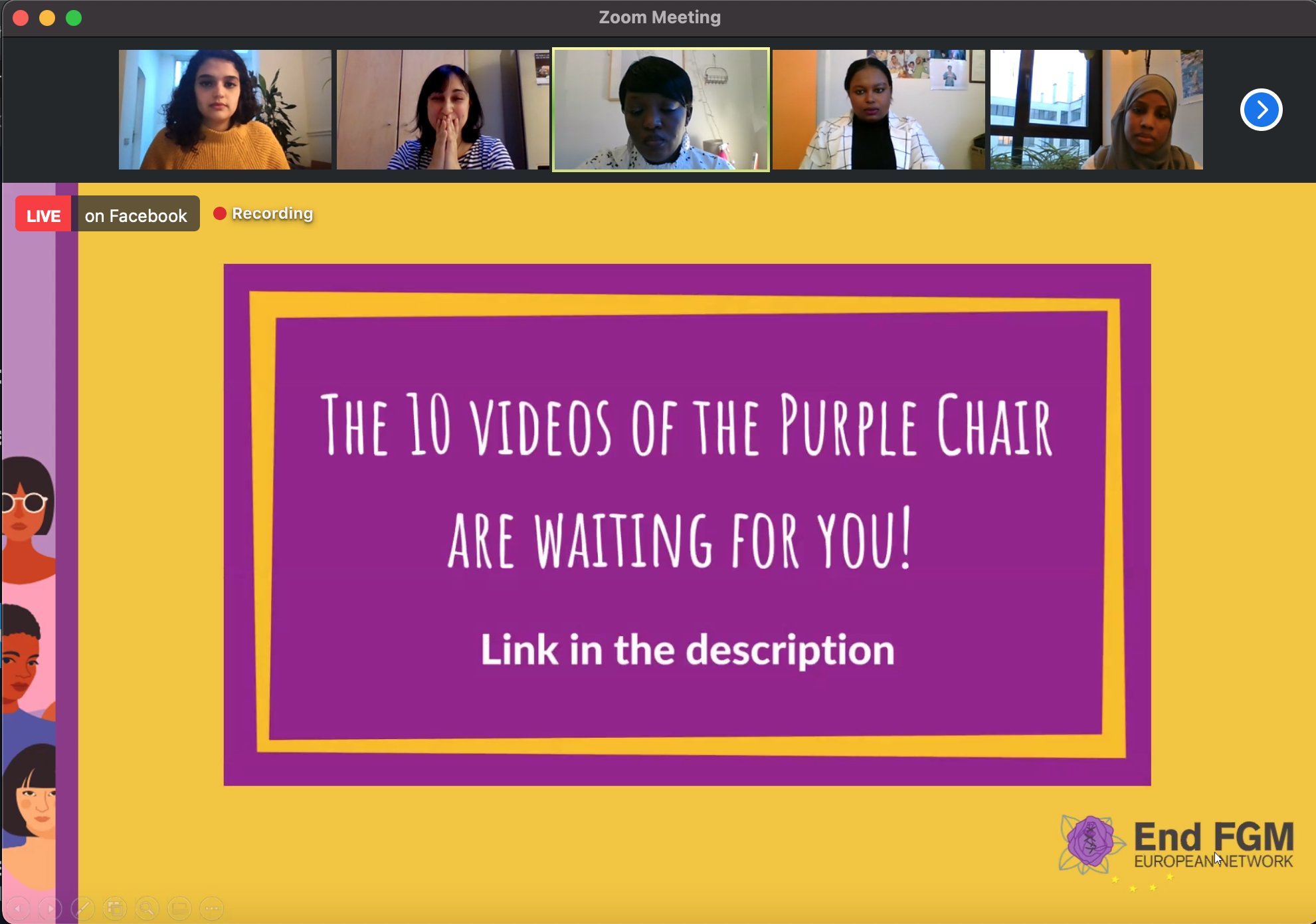 Moreover, on 26 November, ActionAid Sweden asked End FGM EU to present The Purple Chair during their Digital Dialogue about their work on FGM and how it has been affected by COVID-19. Isma Benboulerbah talked about young people's role in the fight against FGM and about The Purple Chair Series.